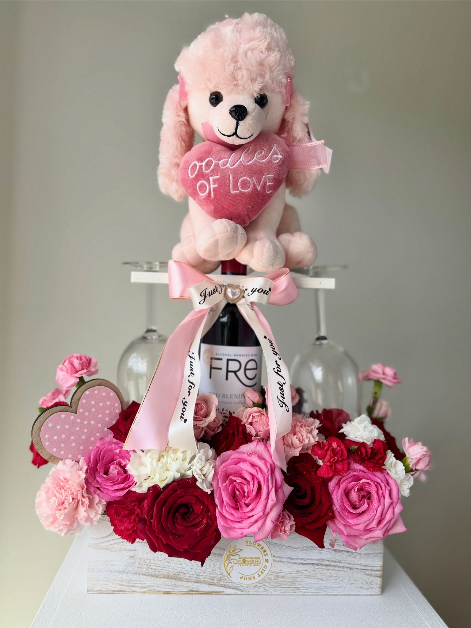 Chic and cute, this is how we can refer to this gorgeous wood box. ‘WIne For 2” is designed with a mix of pink and red freedom premium Ecuadorian roses and flowers fillers, along with an adorable stuffed animal, a red wine and two wine glasses.