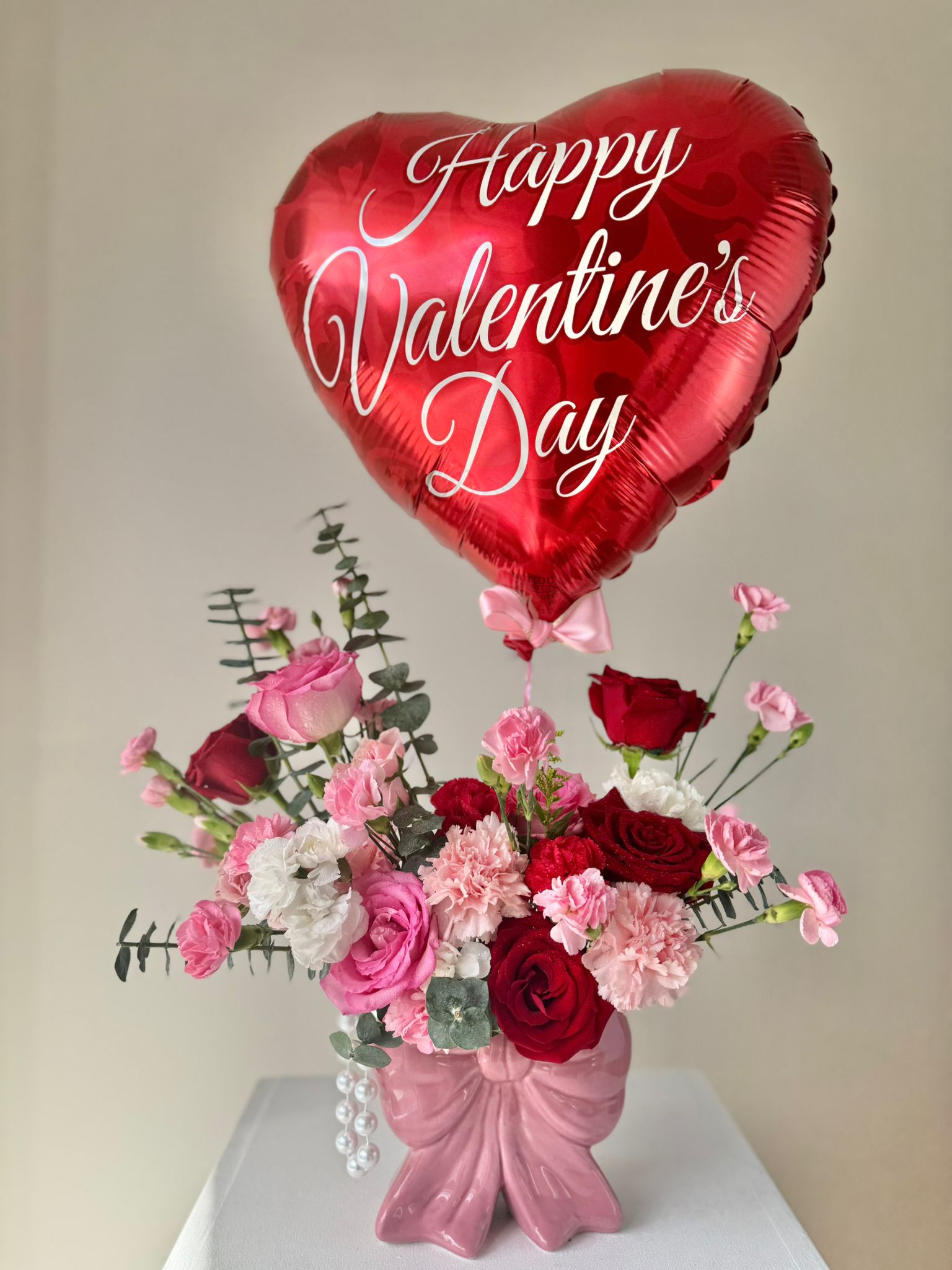 ”My Valentine” is Gorgeous, delicately handcrafted, presented in a ceramic vase with a helium balloon. It contains roses and a seasonal flowers mix.