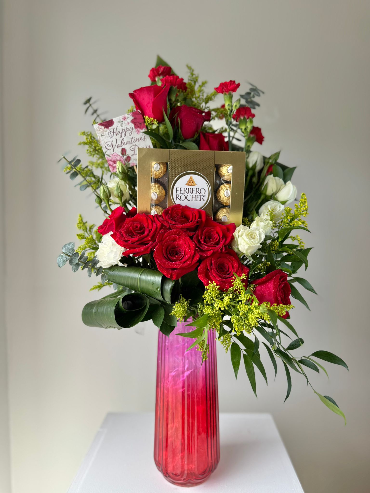 This  stunning floral arrangement made with premium Ecuadorian roses and other flowers filler and a box Ferrero Chocolates on a tall glass base with beautiful seasonal color combinations.