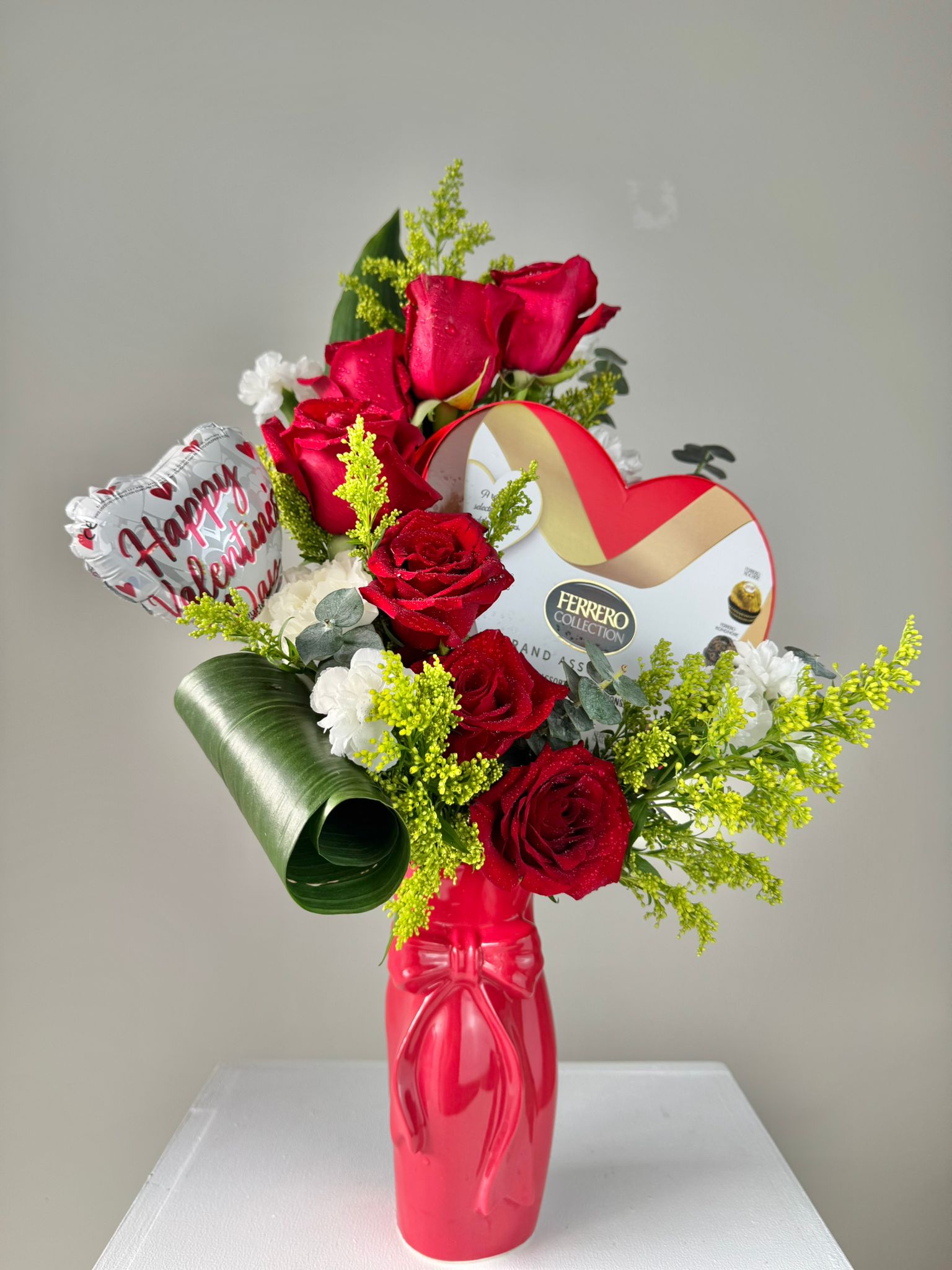 ” The Dreamer Lover ” is simply perfect to bright to your the love of your life . Using a perfect combination of seasonal floral, with a Box Ferrero Chocolates on ceramic vase.
